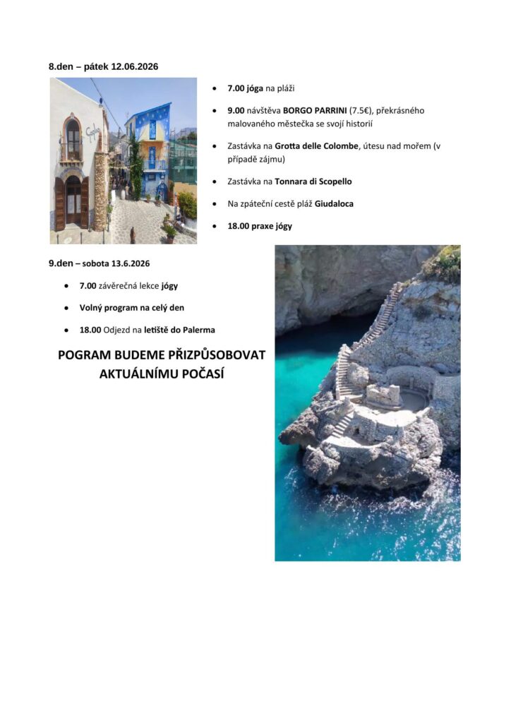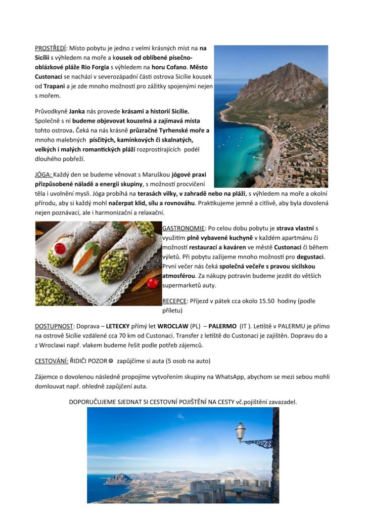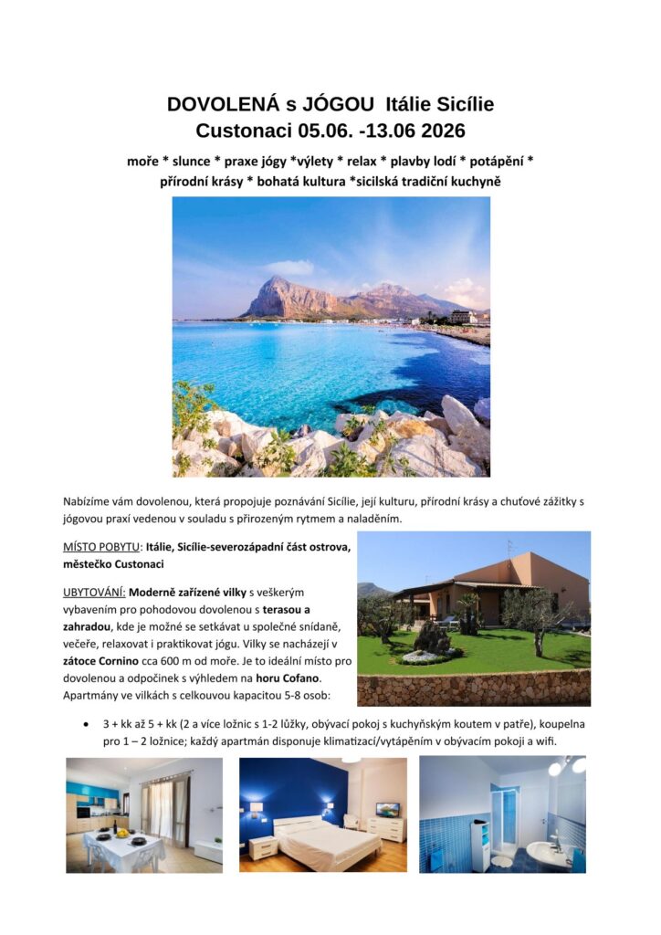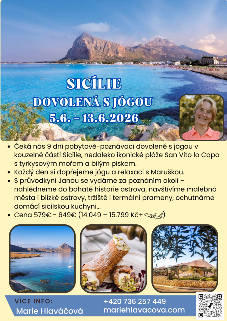 Od r. 2023 pořádám dovolenou s jógou. První rok to byl týden s jógou v Podgoře v Chorvatsku. Další dva roky jsme jezdili do Nemiry poblíž Omiše na 2 týdny. Byly to vždy přelomové týdny červen / červenec, aby mohli jet i lidé, kteří mohou volit dovolenou pouze o prázdninách. V letošním roce se v červnu 2026 necháme překvapit Sicílií a v červenci opět Chorvatskem...